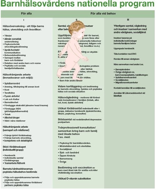 Barnhälsovårdsprogrammet innehåller tre delar och illustreras på Rikshandboken av en tabell med tre kolumner i tre gröna nyanser (se bild).